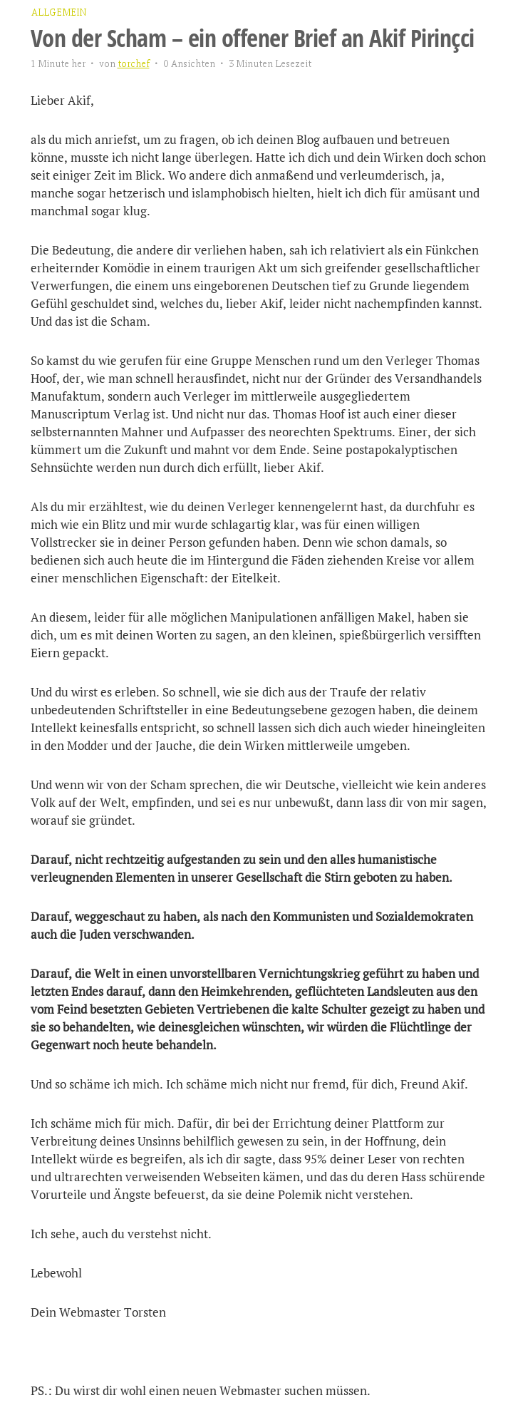 Dieser Torsten, den Johannes Boie im zweiten Artikel auf der heutigen SZ-Seite 3 würdigt (unfrei online), ist jetzt jedenfalls nicht mehr Pirinccis Webmaster. Vielleicht kann Pirincci den Text nicht von der-kleine-akif.de entfernen und lässt erst mal seine ganze Webseite abgeschaltet, um diesen Text dort nicht zu stehen zu lassen, vielleicht ist Webseite einfach überlastet, nachdem der Autor noch mal groß durch die Medien ging.